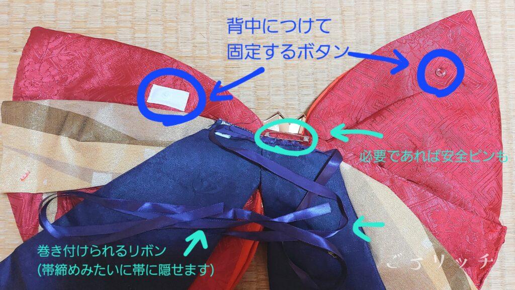 後ろの帯リボンも本当の着物と遜色ない質感です。