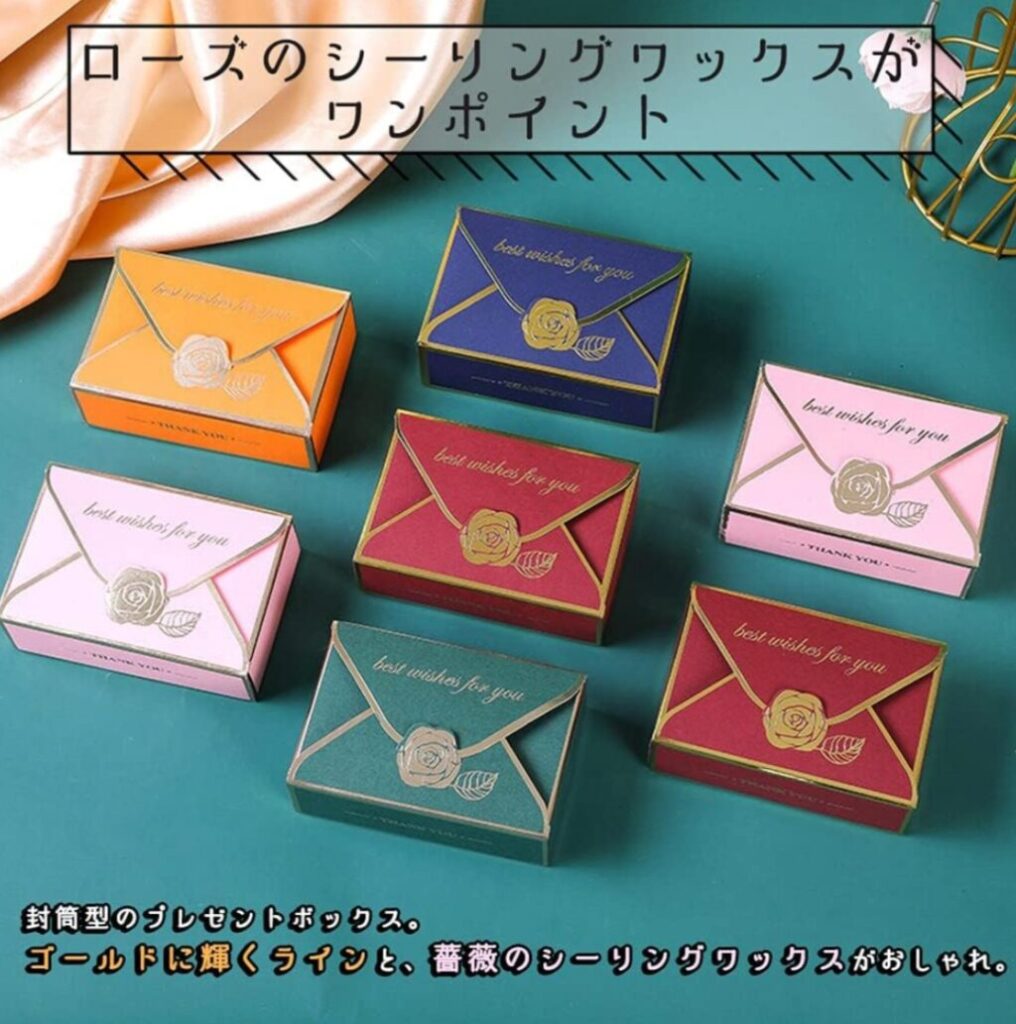 お手紙のようなデザインで、パイピングとシーリングワックスがおしゃれなボックス。