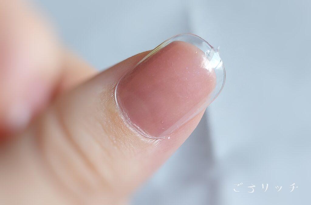 自爪にするのと同様、シールをチップに沿わせてサイズを確認し大きさの合うシールを貼ります(はみ出たところは削れるのでチップよりシールが小さくなければOK)