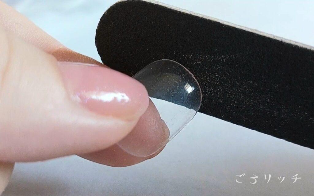爪の根元の形をチップと合わせるため、ネイルファイル(粗いやつ)で削ります。ついでにバリも削る。削れたらスポンジファイル(細かいやつ)で整えます。